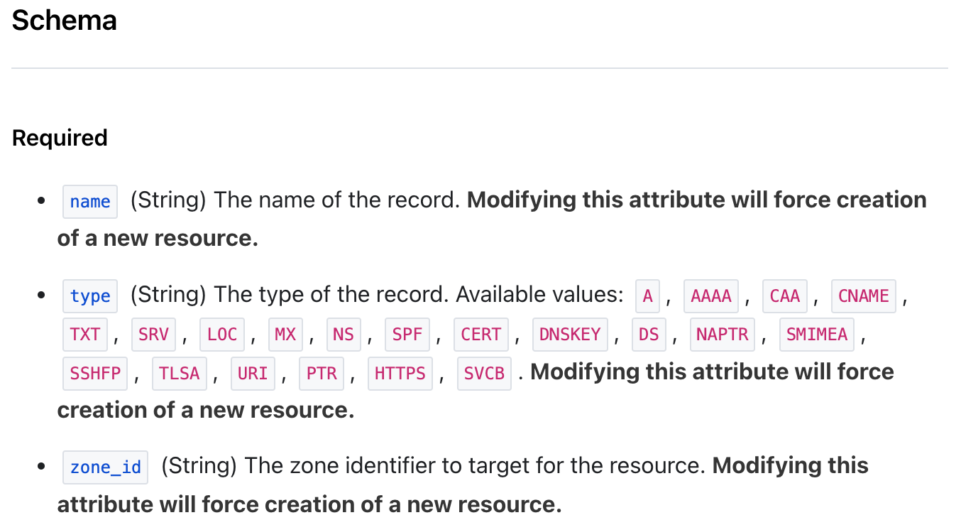 }4. If a more complex DNS record is necessary with additional configuration, do we do a bunch of rope jumping to allow this ? How do we validate individual records effectively ? Look at all the options here: https://registry.terraform.io/providers/cloudflare/cloudflare/latest/docs/resources/record.
